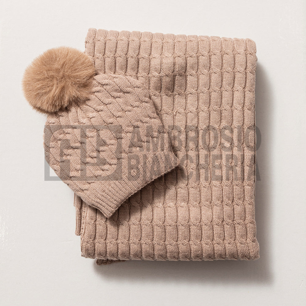 Copertina smacchinata per neonati in 50% viscosa 18 % poliestere e 22% nilon morbida sulla pelle disponibile in vari colori nella misura 75X90cm , cappellino taglia unica