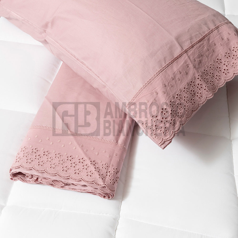 La confezione contiene: lenzuolo sopra ricamato, lenzuolo sotto con angoli e federe a sacco.