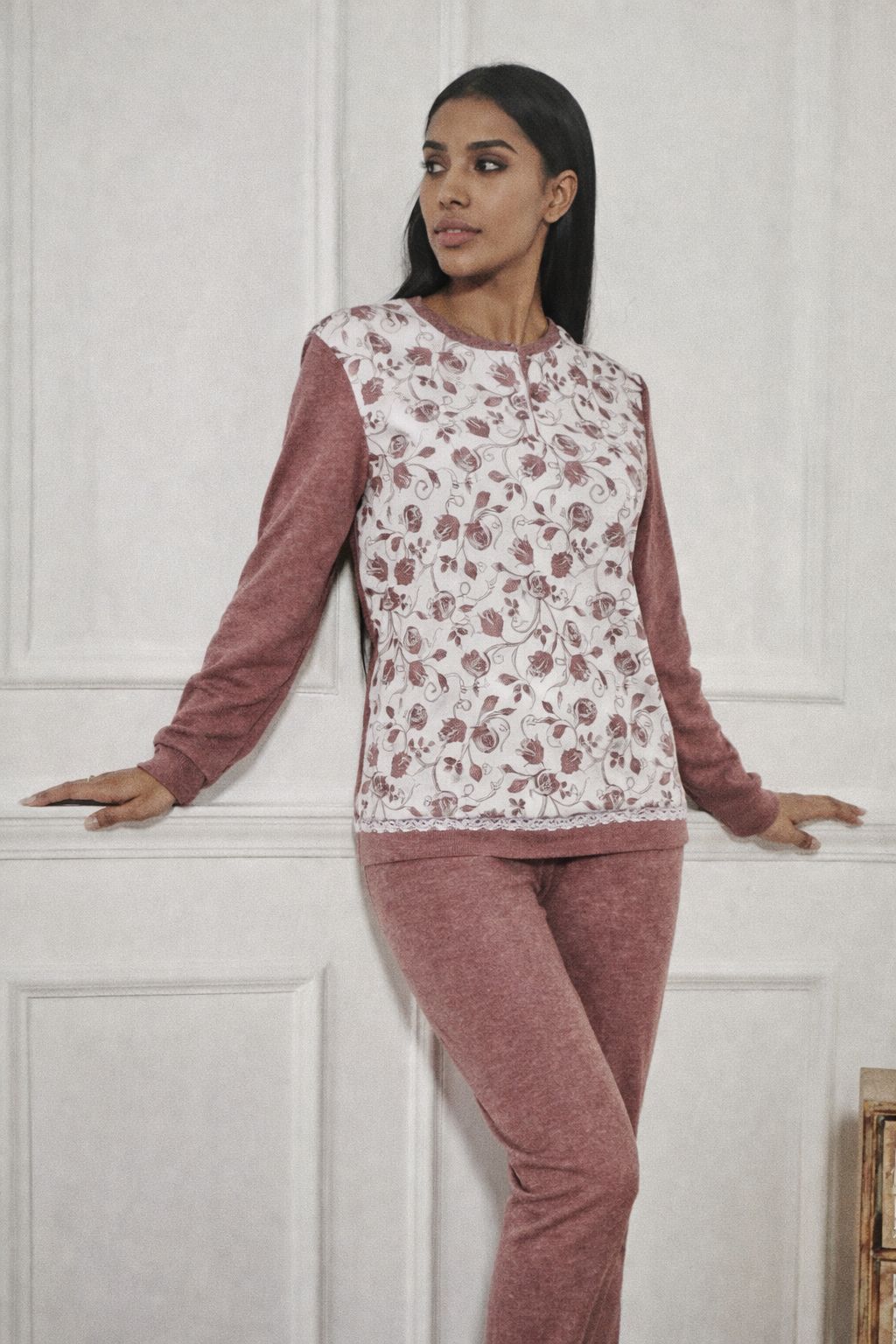 Pigiama donna manica lunga e pantalone lungo con bordi in punto milano 35% cotone 65 % poly , vestibilita' regolare interamente realizzato in Italia