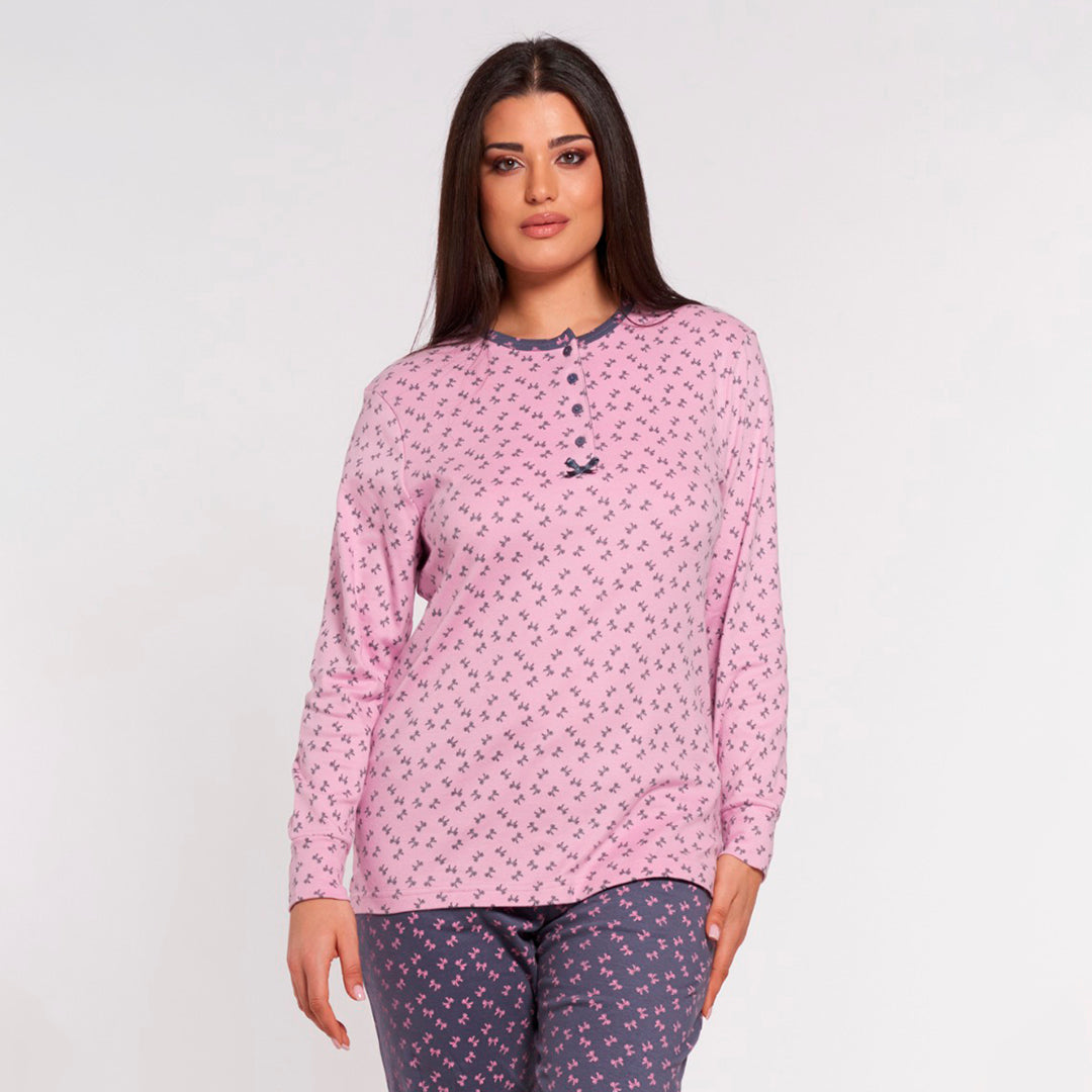 Pigiama donna manica lunga e pantalone lungo in 100% caldo cotone, vestibilita' regolare pantalone con bordi