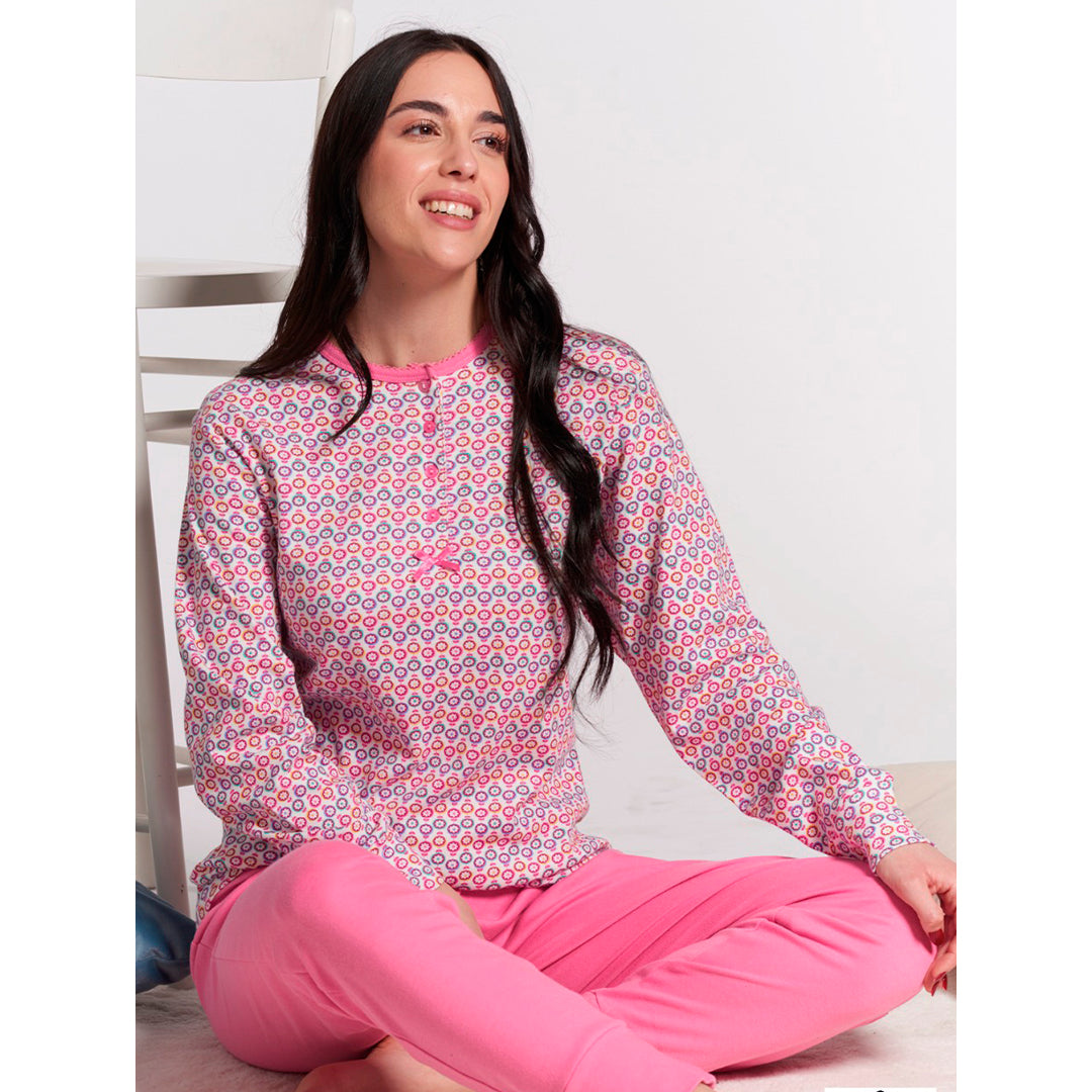 Pigiama donna manica lunga e pantalone lungo con bordi in 100% caldo cotone, vestibilita' regolare