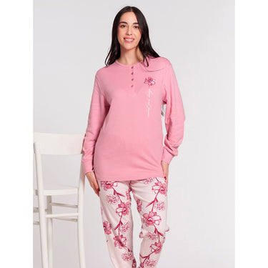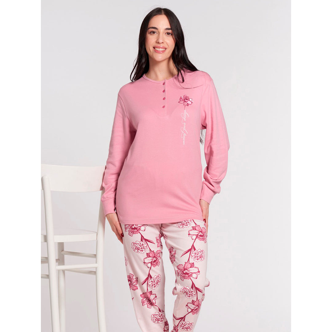 Pigiama donna manica lunga e pantalone lungo con bordi in 100% caldo cotone, vestibilita' regolare