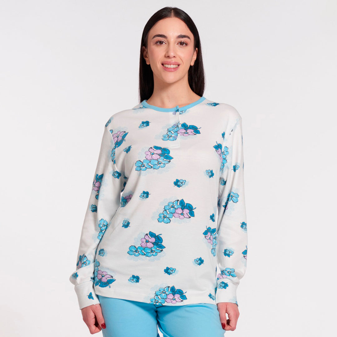 Pigiama donna manica lunga e pantalone lungo in 100% caldo cotone, vestibilita' regolare pantalone con bordi