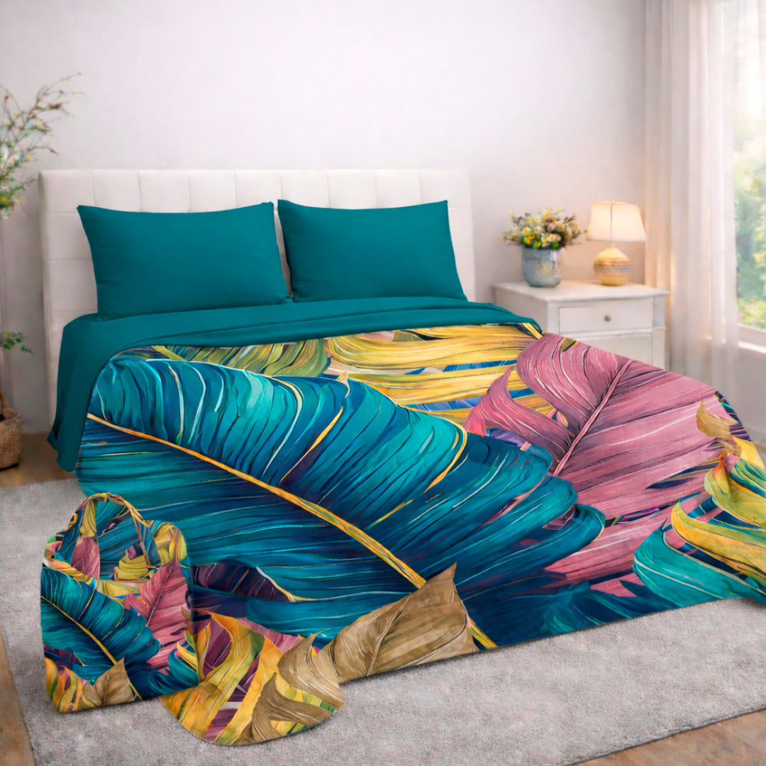 Trapuntino matrimoniale in morbida microfibra 260X260 cm confezionato in borsa di tessuto riutilizzabile della stessa fantasia del trapuntino. Imbottitura 180gr poliestere anallergico