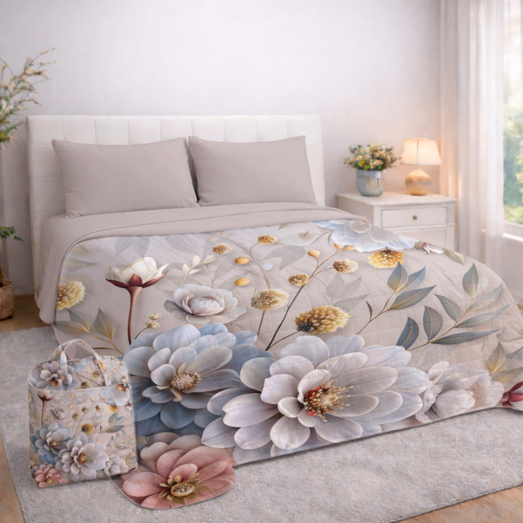 Trapuntino matrimoniale in morbida microfibra 260X260 cm confezionato in borsa di tessuto riutilizzabile della stessa fantasia del trapuntino. Imbottitura 180gr poliestere anallergico