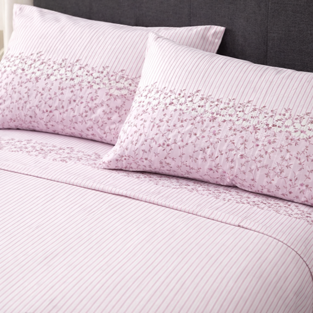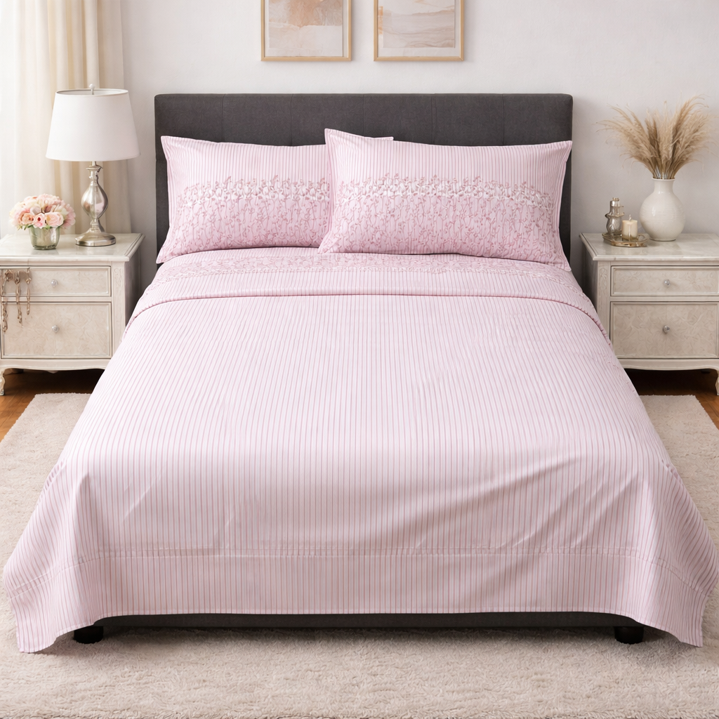 Lenzuolo sopra 250X290 cm, lenzuolo sotto con angoli 180x200cm+28cm , 2 federe 52x82 cm. 100% cotone made in Italy