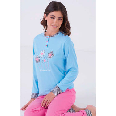 Pigiama donna manica lunga e pantalone lungo con bordi 100% cotone , vestibilita' regolare