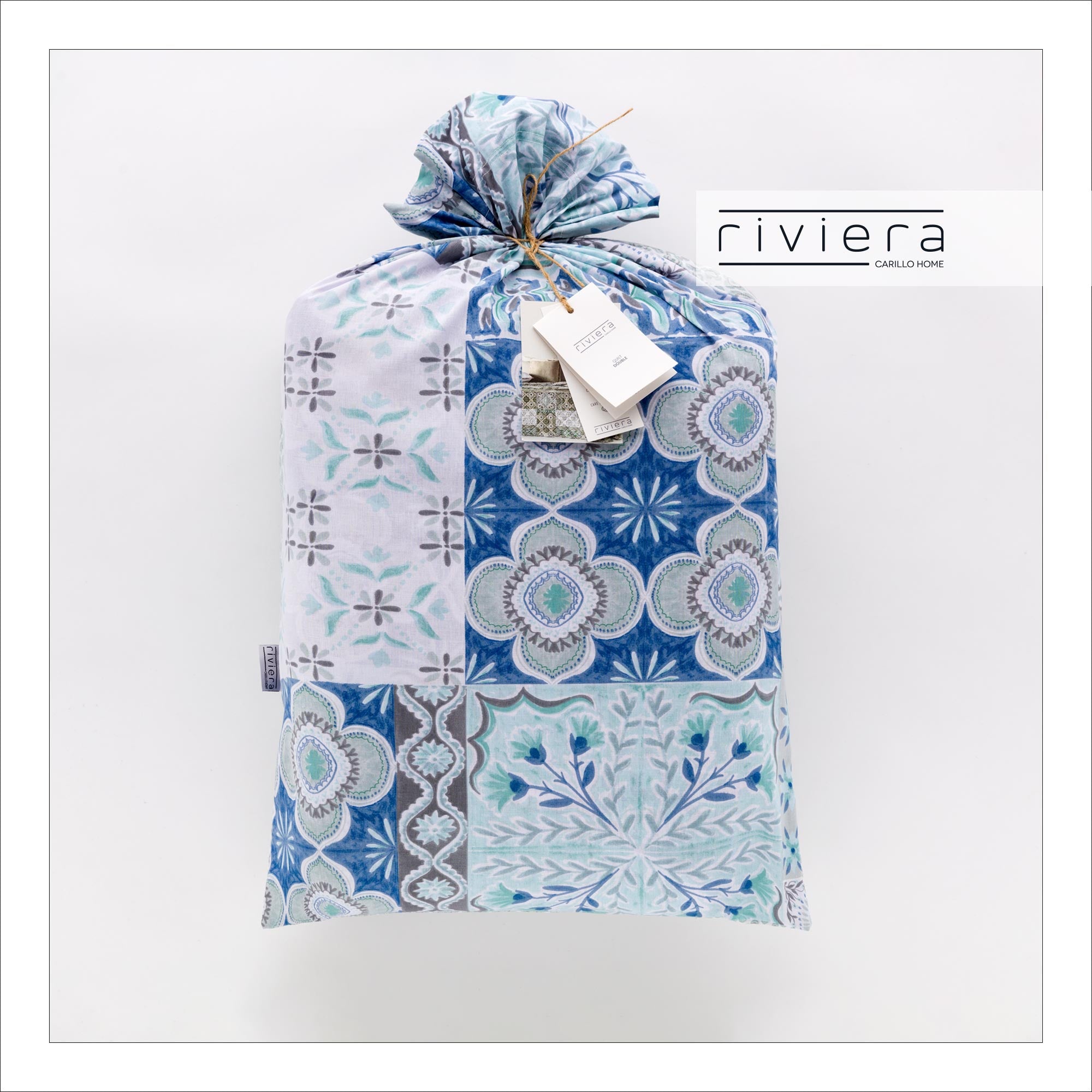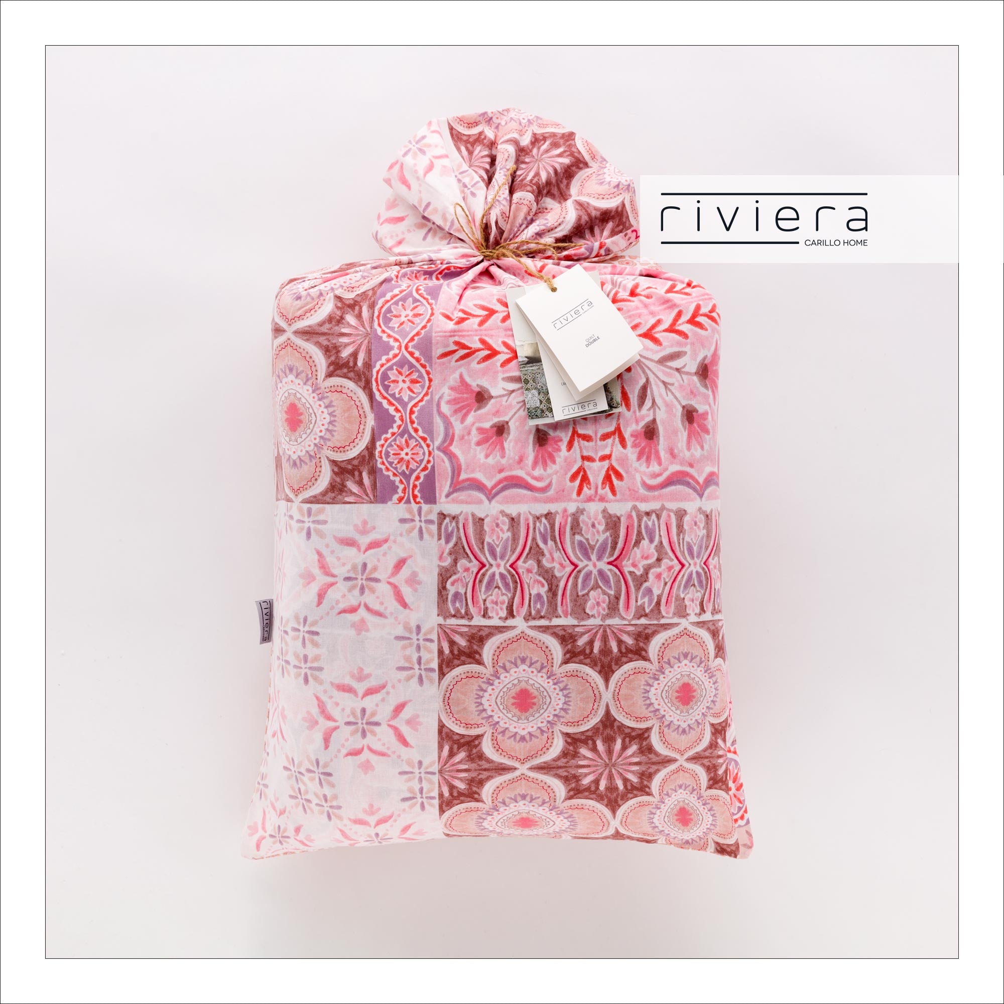Trapuntino 100% cotone stampato double face, confezionato in un pack ecologico che puo' essere utilizzato come una federa.